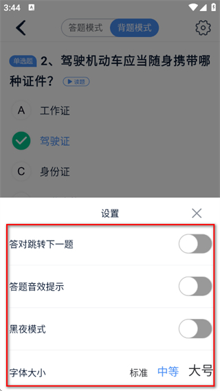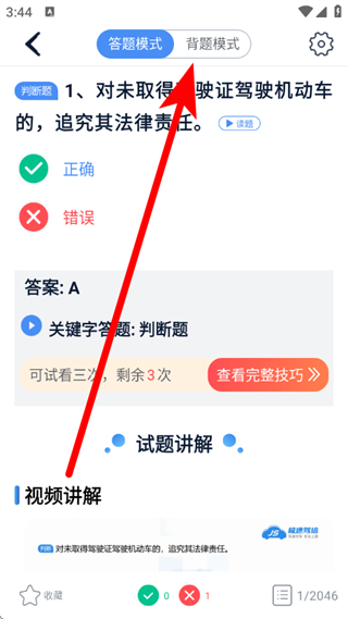 2、在答題模式頁面,點擊切換到背題模式,進(jìn)入背題模式頁面。