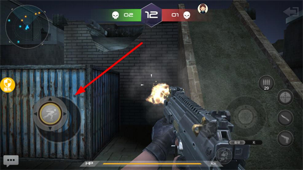 1、左側(cè)虛擬搖桿控制移動,可靈活走位尋找掩體,如集裝箱、磚墻后都可作為掩護(hù),避免被敵方持續(xù)攻擊。