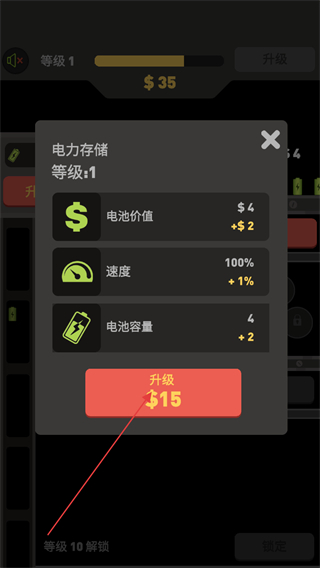 2、點擊電力存儲器的升級按鈕可以通過升級提高電池的價值和傳輸帶的運行速度。