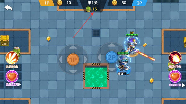 2、利用武器射擊僵尸,消滅僵尸可獲得金幣獎勵,同時注意上方的僵尸數(shù)量計數(shù),逐步清空關卡內的僵尸。