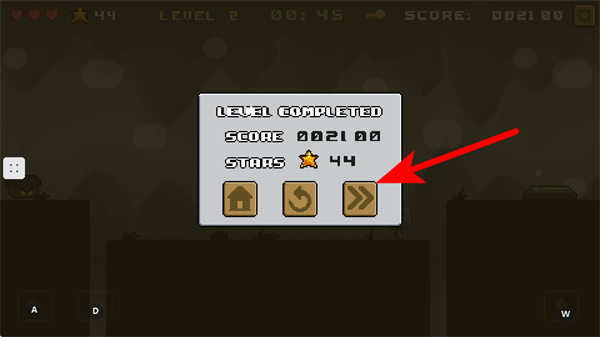 4、游戲關(guān)卡完成后,我們需要點(diǎn)擊帶有雙箭頭的按鈕,可進(jìn)入下一關(guān)繼續(xù)游戲,這是持續(xù)挑戰(zhàn)新關(guān)卡的關(guān)鍵操作。