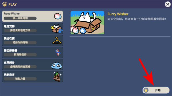 3、在功能菜單界面,點擊開始按鈕,進入寵物抽取或相關(guān)游戲環(huán)節(jié)。