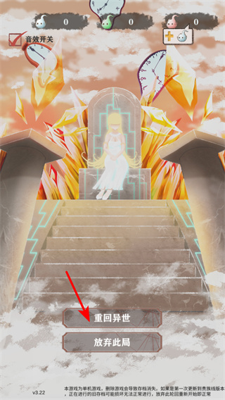 1、游戲中點(diǎn)擊重回異世按鈕,可進(jìn)入人生模擬的冒險(xiǎn)旅程,這是開啟游戲的關(guān)鍵操作,點(diǎn)擊后將正式進(jìn)入角色的成長(zhǎng)劇情。