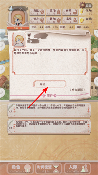 2、在劇情界面點(diǎn)擊繼續(xù)按鈕,可推進(jìn)角色的人生階段,這是解鎖新事件和屬性的關(guān)鍵操作,點(diǎn)擊時(shí)需關(guān)注劇情的發(fā)展走向。