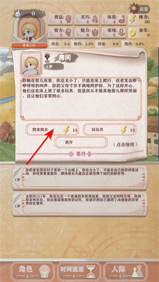 3、面對(duì)童年事件選擇,需根據(jù)屬性提升需求進(jìn)行點(diǎn)擊,這是塑造角色能力的關(guān)鍵步驟,選擇時(shí)需兼顧勇氣屬性的均衡發(fā)展。