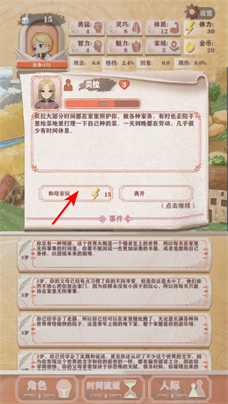 4、在與NPC的互動(dòng)中點(diǎn)擊如和母親玩之類的選項(xiàng),可提升人際關(guān)系和屬性,這是關(guān)鍵操作,互動(dòng)時(shí)需關(guān)注NPC性格需求。