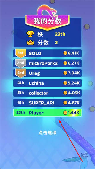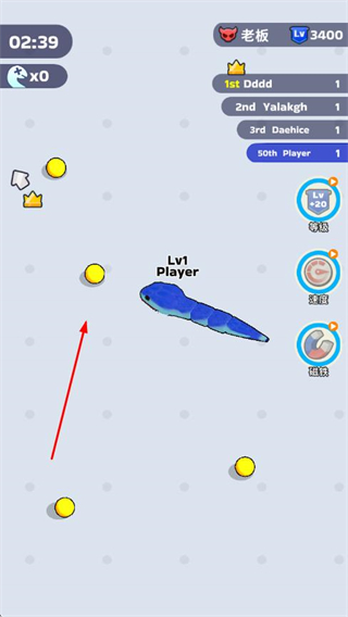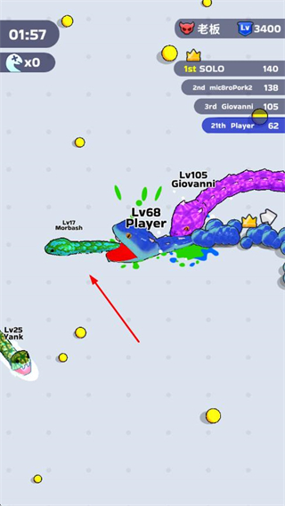 3、在場景中躲避其他玩家的大蛇,同時(shí)尋找機(jī)會撞擊其他小蛇,淘汰對手?jǐn)U大自己的生存空間。