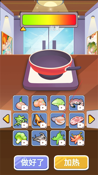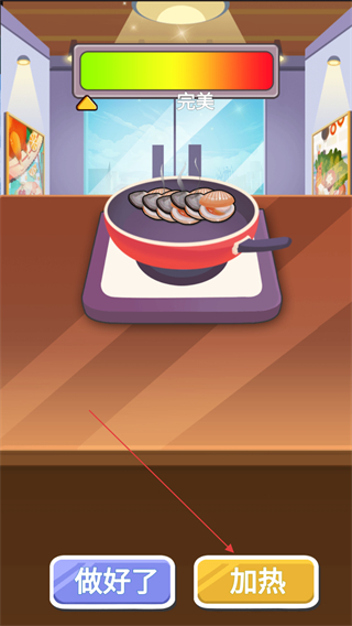 3、添加食材后,點擊加熱按鈕開始烹飪,過程中關注上方的完美進度條。