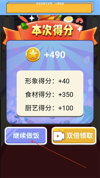 4、烹飪完成后,得分達標即可過關,之后可選擇繼續(xù)做飯?zhí)魬?zhàn)下一關或領取獎勵。