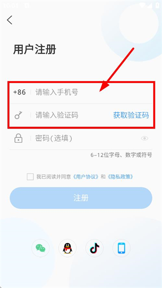 4、在用戶注冊頁面,輸入手機(jī)號,獲取驗證碼并輸入驗證碼。