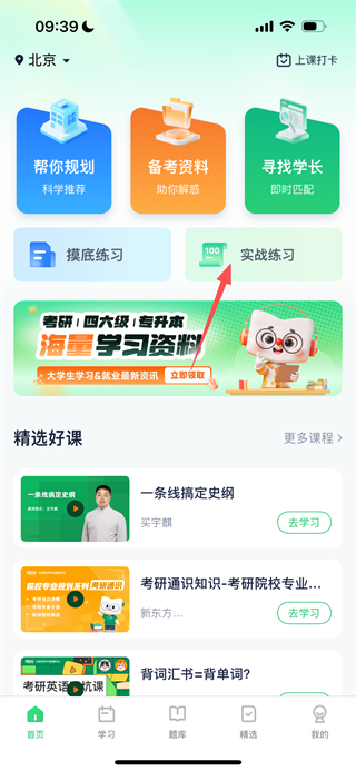 1、在新東方大學(xué)考試首頁(yè),點(diǎn)擊實(shí)戰(zhàn)練習(xí)選項(xiàng),進(jìn)入考研實(shí)戰(zhàn)練習(xí)頁(yè)面。