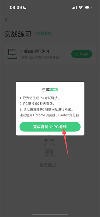 4、在生成成功彈窗中,點(diǎn)擊完成復(fù)制去PC考試,可在PC端進(jìn)行考試。