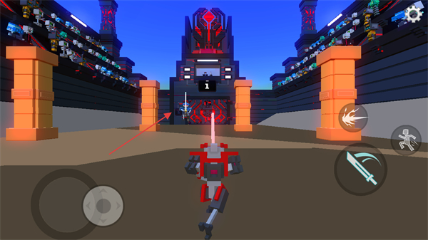 1、通過(guò)左側(cè)搖桿控制機(jī)器人移動(dòng),右側(cè)按鈕使用武器和技能,在角斗場(chǎng)中與敵人戰(zhàn)斗。