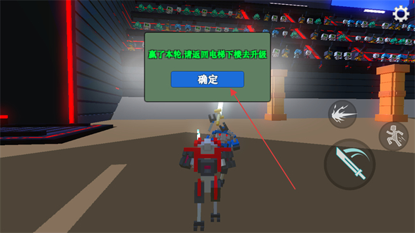 3、獲勝后點(diǎn)擊確定,返回電梯下樓升級(jí)機(jī)器人,提升戰(zhàn)力。