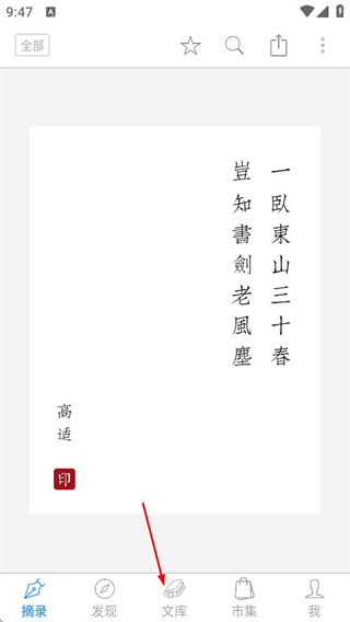 1、在詩詞之美摘錄頁面,點(diǎn)擊底部文庫(kù)選項(xiàng),進(jìn)入文庫(kù)頁面。