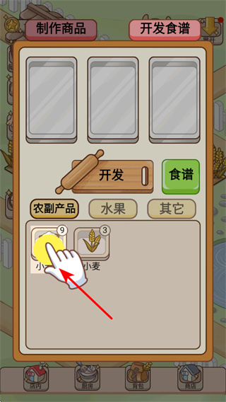 3、進入制作商品界面后選擇如小麥之類的農副產品,可開發(fā)食譜制作食品,這是開展經營關鍵操作,根據原料庫存需求搭配。