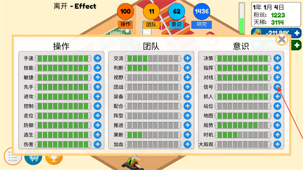 2、在研究界面選擇自我能力提升。,進(jìn)入后可以看到自身的各項屬性,點擊加號可以消耗研究點數(shù)進(jìn)行提升