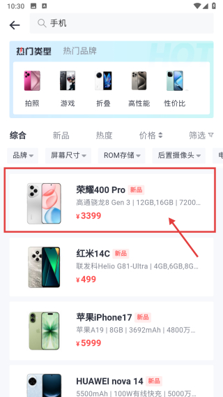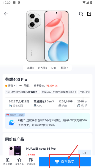 3、在手機(jī)產(chǎn)品列表里,選擇榮耀400-Pro條目,進(jìn)入產(chǎn)品詳情頁。