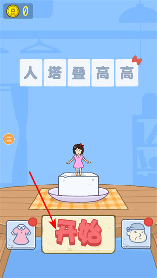 1、游戲中點(diǎn)擊開始按鈕,可進(jìn)入人塔疊高高玩法,這是開啟游戲的關(guān)鍵操作,點(diǎn)擊后將開始堆疊挑戰(zhàn)。