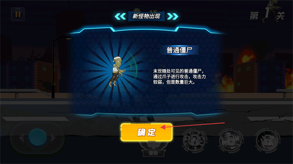 1、點擊確定,了解普通僵尸的屬性,其攻擊力較弱但數(shù)量巨大,準備迎接戰(zhàn)斗。