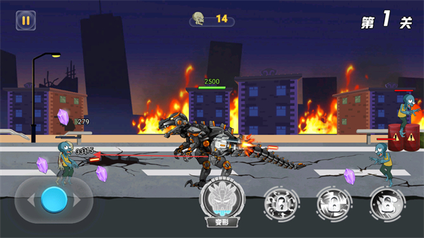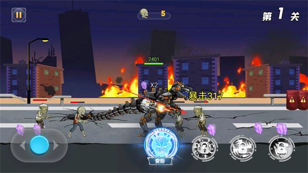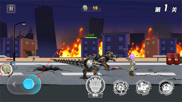 4、點擊變形按鈕,釋放機甲技能,對僵尸造成大范圍傷害,快速清理剩余敵人,推進關(guān)卡。