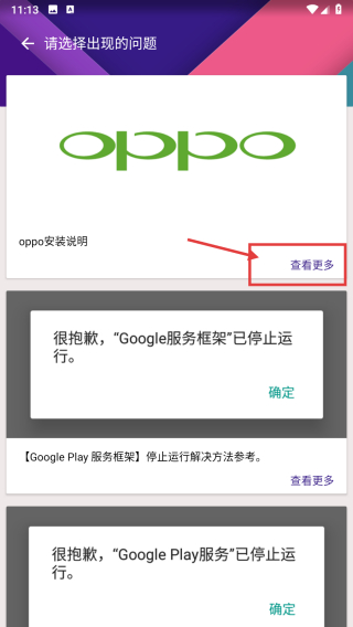 3、在問題選擇頁面,找到oppo安裝說明區(qū)域,點擊查看更多選項,進入安裝說明頁。