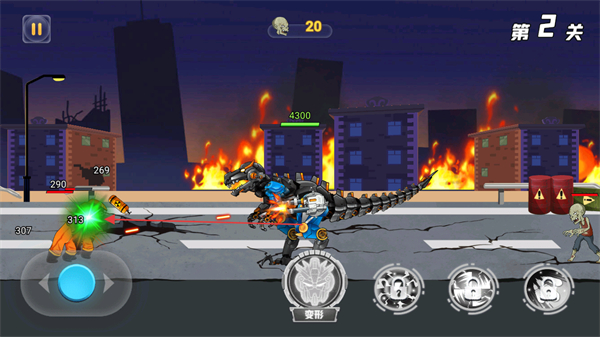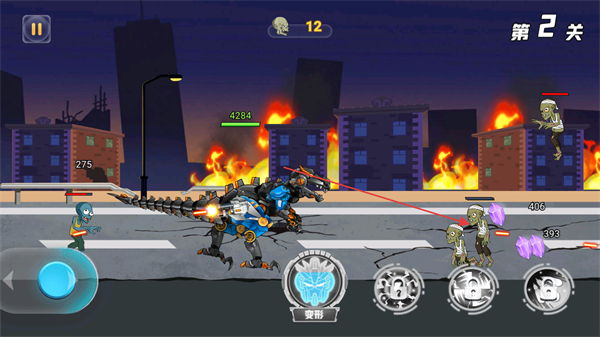 2、通過左側(cè)搖桿控制機(jī)甲移動(dòng),在第2關(guān)的城市廢墟中與僵尸戰(zhàn)斗,發(fā)起攻擊。