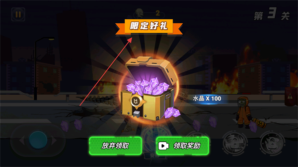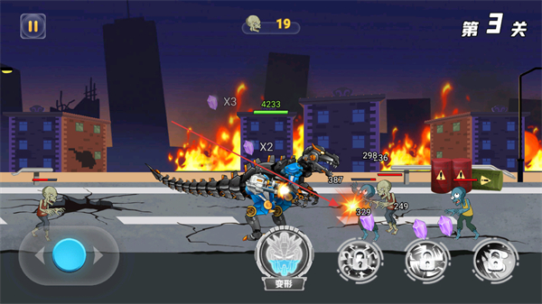 1、在第3關(guān)操控機(jī)甲移動(dòng),攻擊地面僵尸,收集紫色水晶資源。