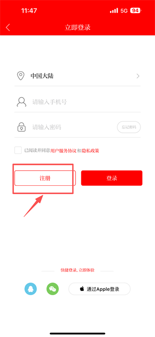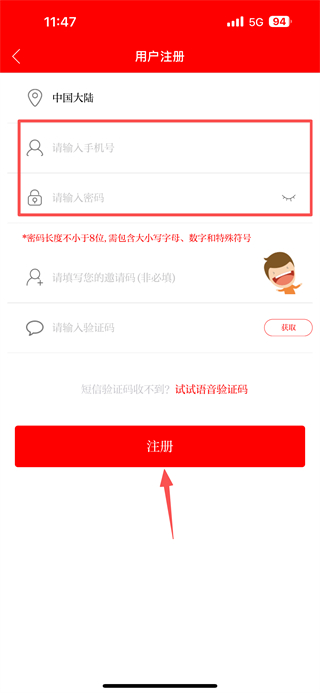 4、在用戶注冊界面,輸入手機(jī)號、密碼等信息,點(diǎn)擊注冊按鈕,完成賬號注冊操作。