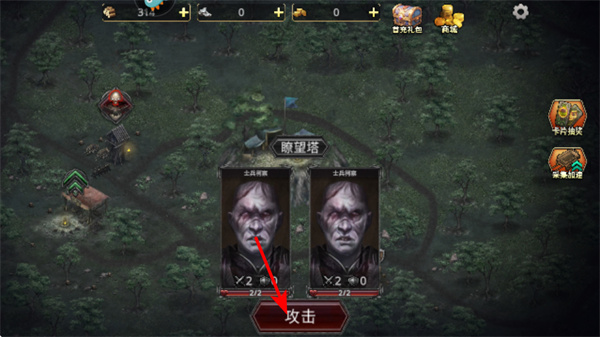 1、游戲中點擊攻擊按鈕,可對瞭望塔等目標(biāo)發(fā)起進攻,這是關(guān)鍵操作,關(guān)注自身兵力和敵方防御強度。