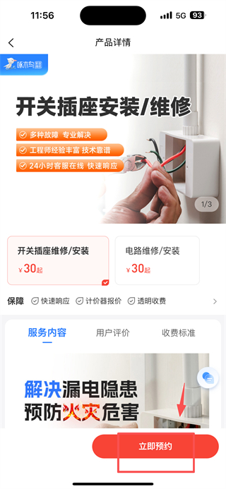 4、在電路服務(wù)詳情頁,點擊立即預(yù)約按鈕,發(fā)起電路維修服務(wù)預(yù)約操作。