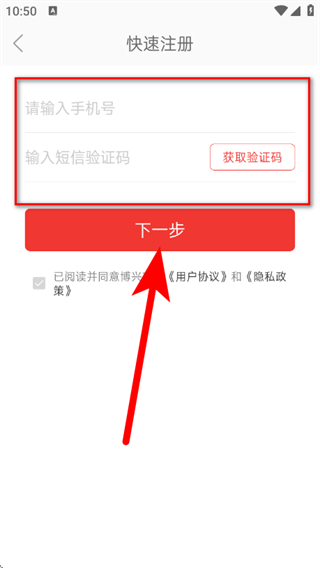 4、輸入手機號,獲取并輸入短信驗證碼,點擊下一步,完成賬號注冊。