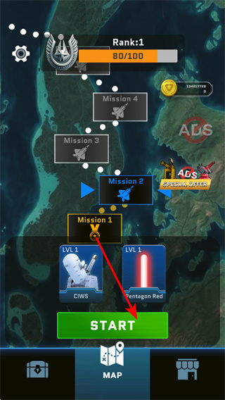 1、游戲中點擊START按鈕,進入防空射擊關(guān)卡,這是開啟游戲的關(guān)鍵操作,將操控激光炮展開防空作戰(zhàn)。