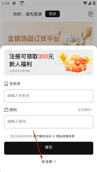 2、在登錄注冊(cè)頁(yè)面,點(diǎn)擊去注冊(cè)選項(xiàng),進(jìn)入注冊(cè)頁(yè)面。