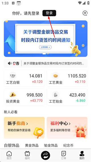 1、在工美珠寶首頁(yè),點(diǎn)擊登錄按鈕,進(jìn)入登錄注冊(cè)頁(yè)面。