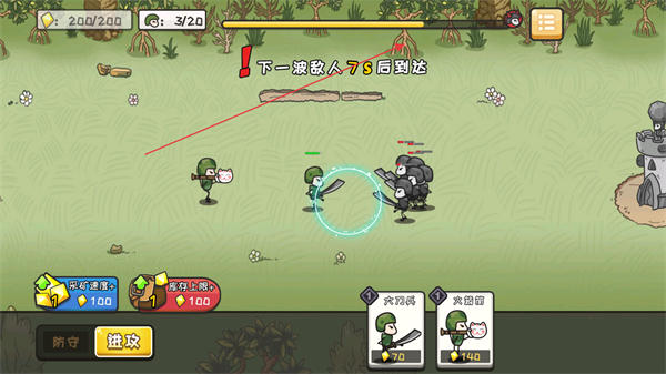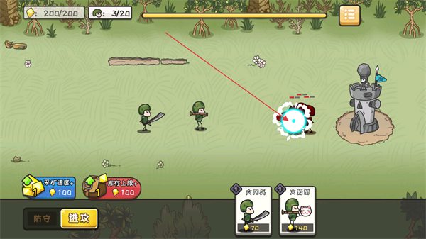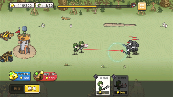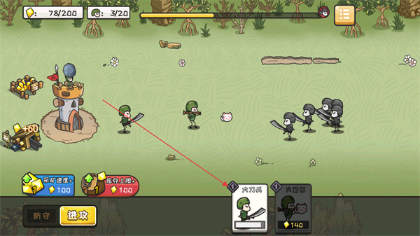 1、派遣持刀小兵和持盾小兵,組成戰(zhàn)斗隊伍,攻擊敵方單位。