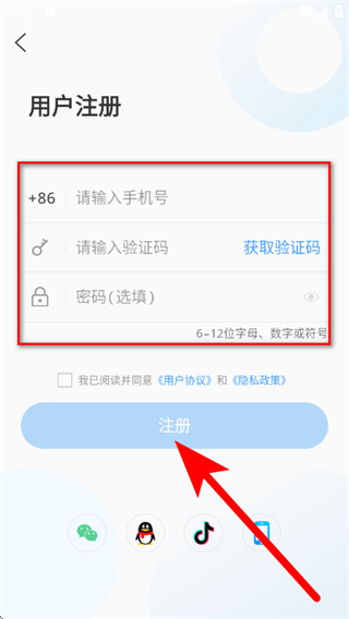 4、輸入手機號,獲取并輸入驗證碼,選填密碼,勾選同意協(xié)議后,點擊注冊,完成賬號注冊。