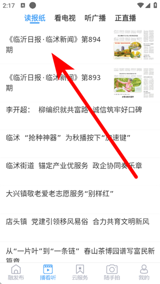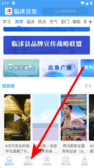 1、打開(kāi)臨沭融媒客戶(hù)端,在首頁(yè)點(diǎn)擊底部播看聽(tīng)。
