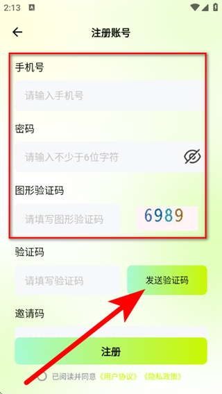 3、輸入手機號、密碼、圖形驗證碼后,點擊發(fā)送驗證碼。