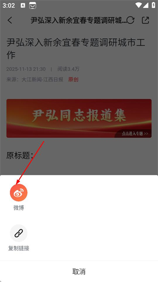 3、在分享選項(xiàng)中,可選擇微博,將新聞鏈接分享到微博。