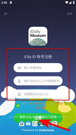4、輸入郵箱地址、用戶ID、設(shè)置密碼,點擊注冊,完成賬號注冊。