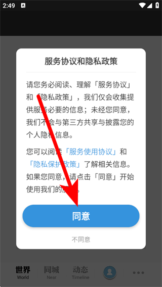 1、打開每日環(huán)球展覽,在服務(wù)協(xié)議和隱私政策彈窗,點擊同意。