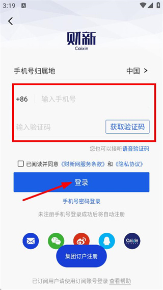 3、在登錄頁面輸入手機號和驗證碼,勾選協(xié)議后點擊登錄完成操作。