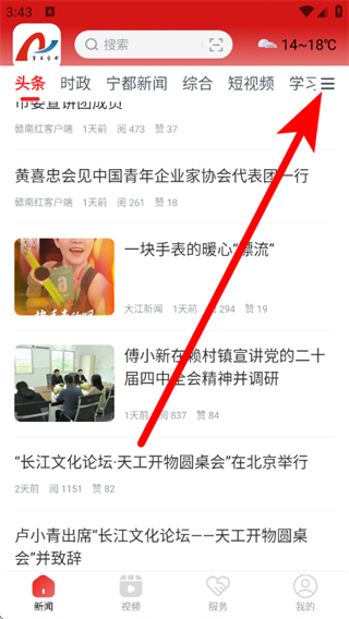 1、打開掌上寧都客戶端,在首頁(yè)點(diǎn)擊右上角三橫線圖標(biāo),進(jìn)入頻道管理。
