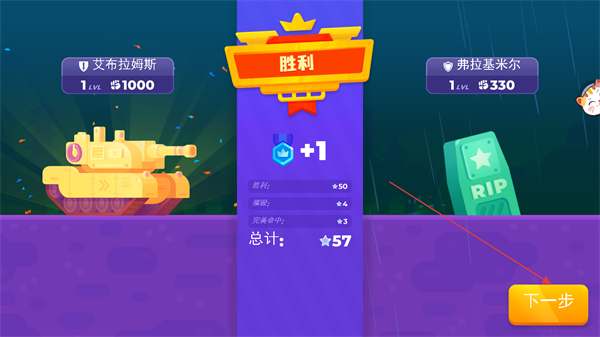 4、擊敗敵方坦克后,點擊下一步按鈕,進入下一場對戰(zhàn)繼續(xù)游戲。