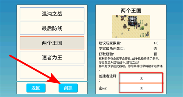 4、選擇地圖點(diǎn)擊創(chuàng)建,可根據(jù)需求設(shè)置注釋和密碼,完成創(chuàng)建之后好友可加入房間。