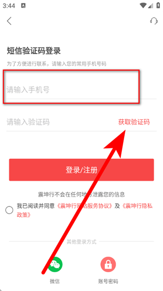3、在登錄頁面,輸入手機號碼后,點擊獲取驗證碼。