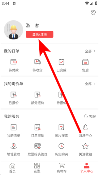 2、在個人中心頁面,點擊登錄注冊,進入注冊頁面。