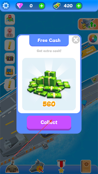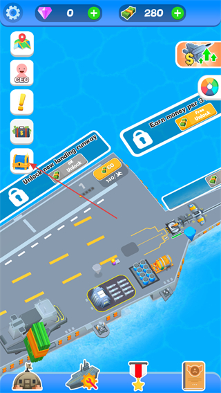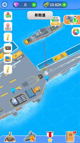 1、通過不斷解鎖設(shè)施提升航母掉落隨機(jī)寶箱等,點(diǎn)擊左側(cè)掉落的寶箱資源可以獲取錢幣等物資。