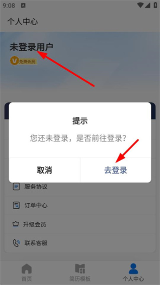 2、在個人中心頁面,點擊上方未登錄用戶,在彈出窗口點擊去登錄。